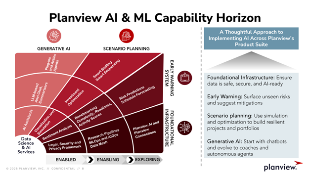 Planview’s Data Fabric stitches those elements together across products, portfolios, and teams, forming the substrate for machine learning and predictive analytics.