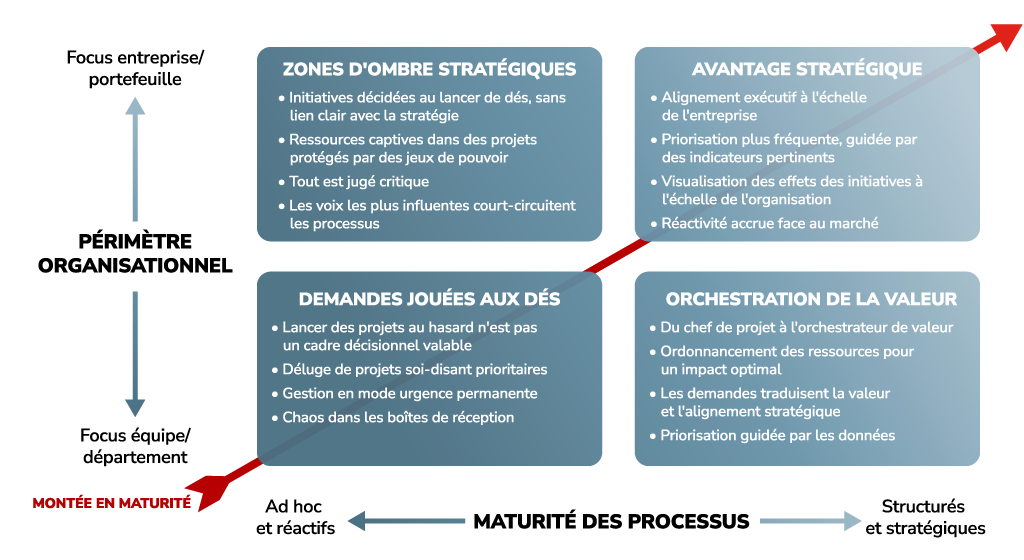 Savoir où se situe votre organisation est la première étape pour sortir du chaos de l'élargissement incontrôlé du périmètre et se recentrer sur la création de valeur. Cette matrice de maturité permet de visualiser simplement le niveau de maîtrise des capacités de gestion de la demande et de priorisation, et d'estimer où vous en êtes... et où vous souhaitez aller.
