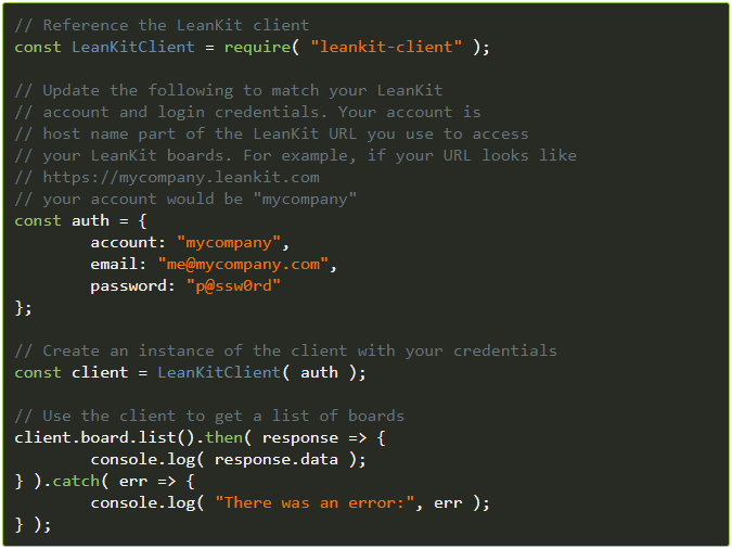 Planview AgilePlace-klienten för Node.js gör det enkelt att få fram en tavla med alla banor och annan information.
